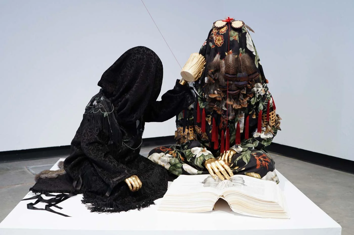 Open Container references containers of knowledge in many forms. It is composed of three life sized figures, their bodies covered almost completely in dark floral fabric embellished with beadwork, tassels, deer toes, feathers, and ribbon work. One of the figures leans over a large book, their head casting a shadow of negative space that has been cut out from the pages below it. Beside this figure, a smaller, child-like figure leans close, holding a rawhide-covered tin can telephone towards the ear of the adult, the phone serving as a transmitter of knowledge between them. At a distance, a second child-size figure holds another tin can telephone, cradling a Tlingit mask woven from the pages of the cut-out book. The scene presents us with various containers for knowledge, culture, connection, and continuum. The title encourages us to act as open containers—the only way we might successfully share and receive knowledge and connection. At the same time, in a reference anti-alcohol “open container” laws, it warns against the dangers of those vessels which we open without realizing their potential to harm, distract, and derail. The work is an amalgamation of what it means to see and be seen, to listen and be heard. It is about continuum and about what can be lost, remembered, and felt.